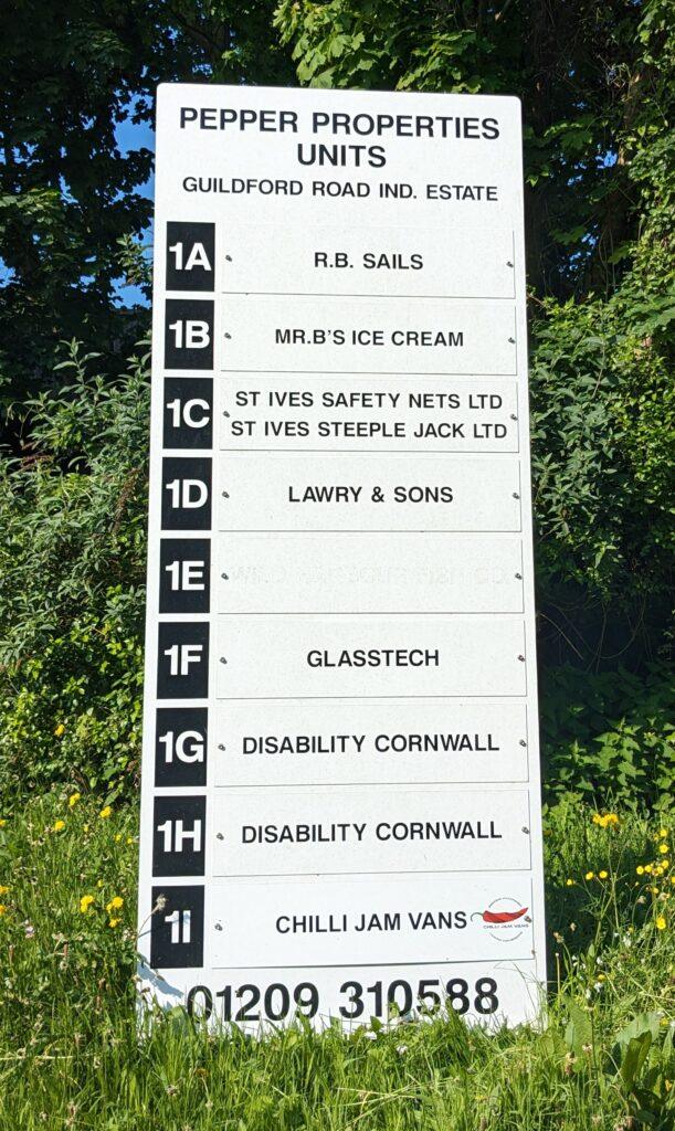 There is clear, easy to read signage to our premises. This comprises a listing on the main industrial estate noticeboard and large signage on our building.