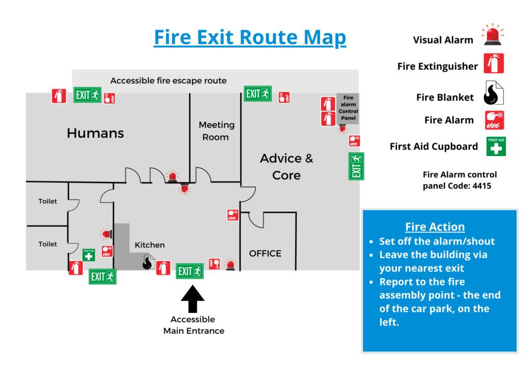 We also give all staff the opportunity to create a Personal Emergency Evacuation Plan, detailing specific ways in which we can support their evacuation from the premises in the event of the fire alarm sounding. Our premises feature fire exit signage which highlight the step-free access routes.