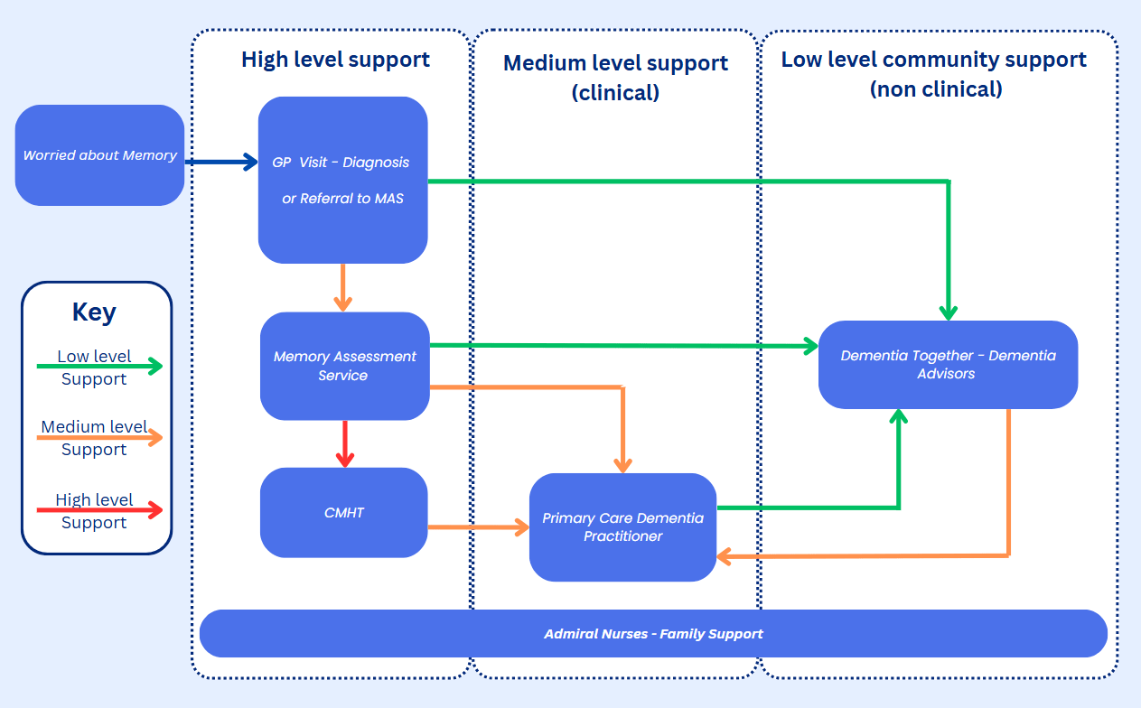 This pathway shows healthcare professionals how people concerned about memory can move between high, medium, and low levels of clinical and community support, from GP assessment and Memory Assessment Services through to dementia advisors and family support, ensuring the right care is provided at each stage.